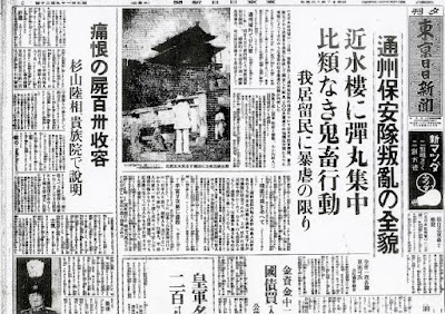 それは1937年7月29日の明け方から始まった。そして1日中続いた。日本人の男、女、子供は野獣のような中国兵によって追いつめられていった。家から連れ出され、女子供はこの兵隊ギャングどもに襲い掛かられた。それから男たちと共にゆっくりと拷問にかけられた。酷いことには手足を切断され、彼らの同国人が彼らを発見したときには、殆どの場合、男女の区別も付かなかった。多くの場合、死んだ犠牲者は池の中に投げ込まれていた。水は彼らの血で赤く染まっていた。何時間も女子供の悲鳴が家々から聞こえた。中国兵が強姦し、拷問をかけていたのだ。