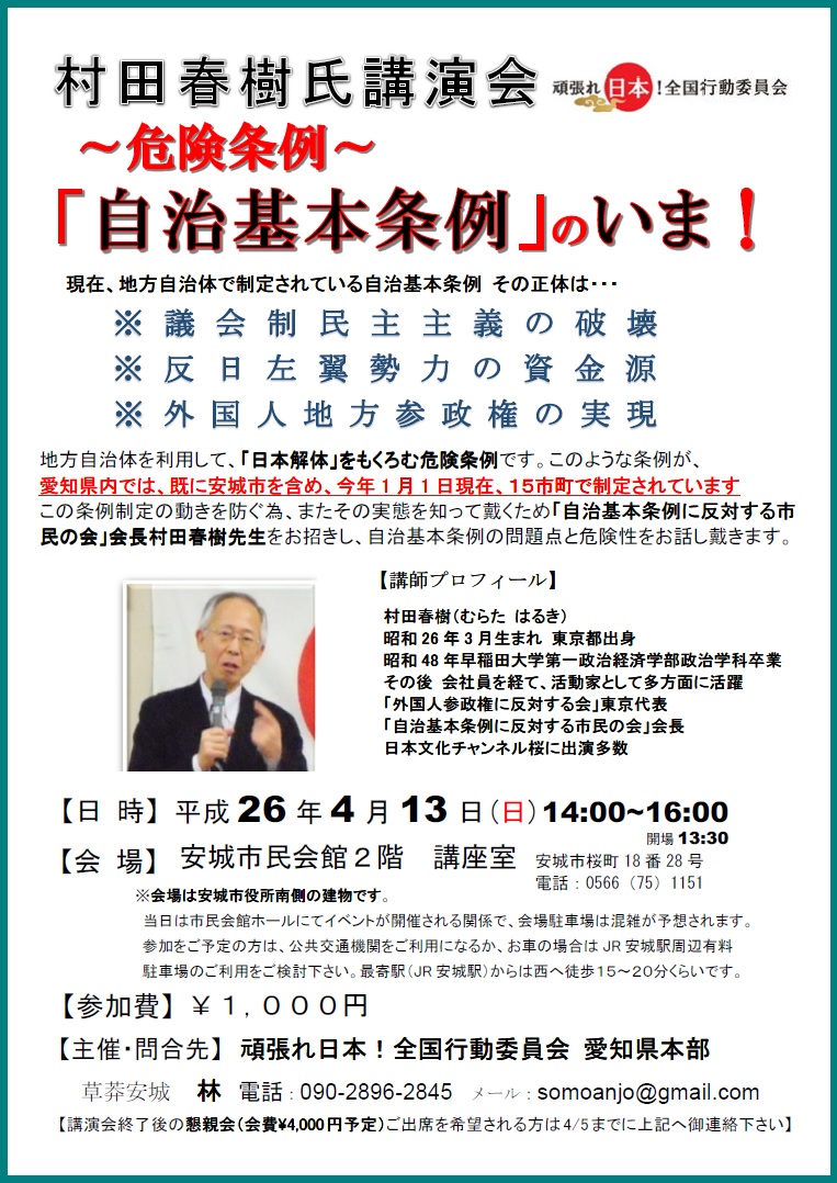 「村田春樹氏講演会」~危険条例~「自治基本条例」のいま!現在、地方自治体で制定されている自治基本条例 その正体は・・・ ※議会制民主主義の破壊 ※反日左翼勢力の資金源 ※外国人地方参政権の実現【日時】平成26年4月13日(日)14:00~16:00*開場 13:30【会場】安城市民会館2階 講座室【参加費】1,000円【主催・問合先】頑張れ日本!全国行動委員会 愛知県本部