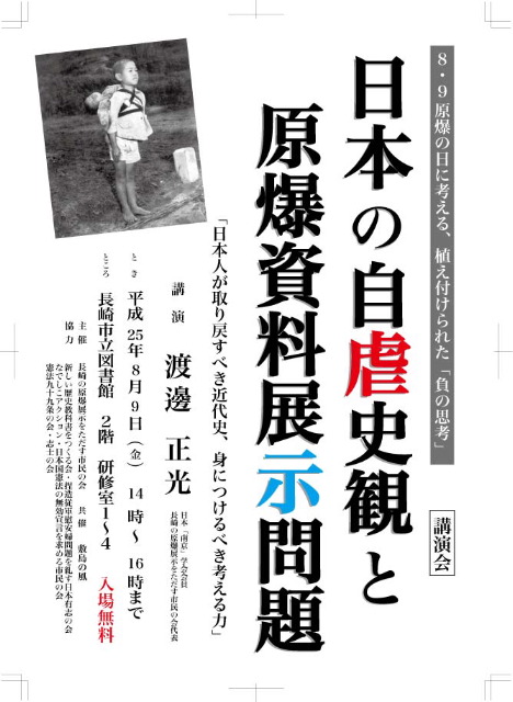 長崎原爆資料館の展示は、人類最大の無差別大量殺戮である原爆投下に至るまで、日本が如何にアジアに悪いことをやってきたかと言うサヨク思想のプロパガンダ展示となりはてています。その展示をただすべく地道な活動を続けてきた 「長崎の原爆資料をただす市民の会」の渡邊代表にスポットを当てた講演会を企画しました。
