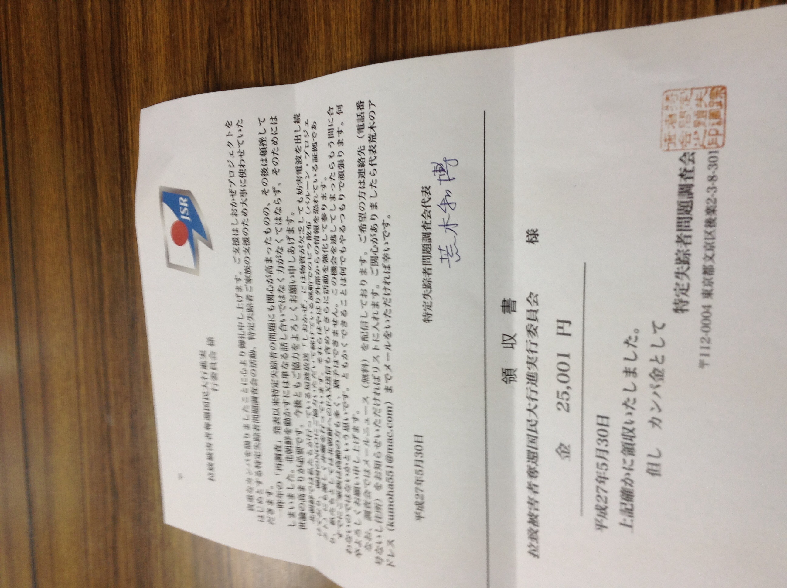 【日時】7月17日(日)13時開始16時終了【場所】靖國神社(九段下理科大周辺)☆ 雨天の場合延期させて頂き【共催】誇りある日本の会【主催】拉致被害者奪還国民大行進実行委員会第24並びに25回定例街頭で頂いた浄財25001円と署名110筆を本日、調査会事務所に届けて参りました。弊會より調査会に還流した浄財853202円、署名3760筆となりました。ありがたう御座いました。