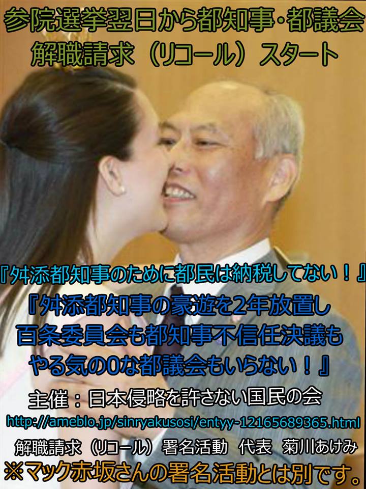 6月18日の時点で舛添都知事辞職が決まれば中止にします。15日午後8時、只今都議会にて舛添都知事の辞職が正式に認められました。これにて正式に舛添都知事リコールを実施する必要がなくなりましたことをご報告申し上げます。この2年間日侵会の舛添都知事リコール活動ご支援頂きまして有難う御座いました。今後公私混同をした舛添都知事の百条委員会での責任追及は必須です