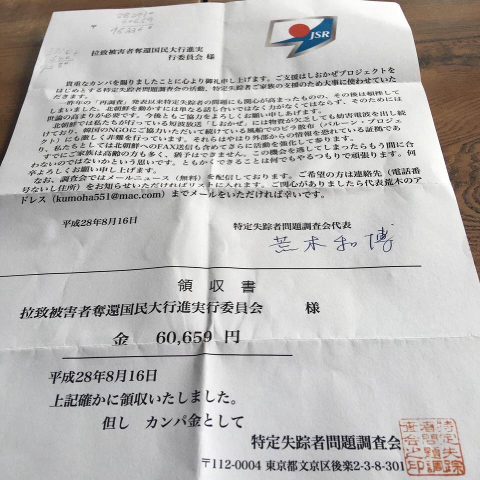 雨天の為、中止とさせて頂きます8月14日に行われました拉致被害者奪還国民大行進及び、15日に行いました、第27回定例街頭署名活動でお預かりした浄財から、2日間の必要経費26000円を差し引いた60659円と、署名540筆を8月16日、特定失踪者問題調査会に届けて参りました。弊会を通じ特定失踪者問題調査会に還流した浄財総額953360円、署名総数4380筆となりました。ご協力頂きました全ての皆様に対し、篤く御礼申し上げます。有難う御座いました