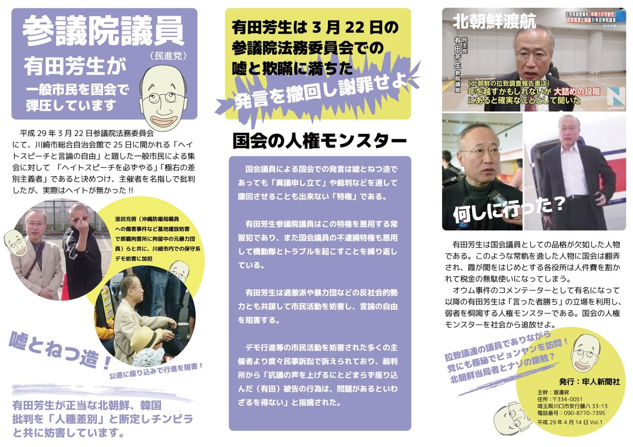 さる平成29年3月22日、有田は参議院法務委員会にて、川崎市総合自治会館で同月25日(土)に開かれた「ヘイトスピーチと言論の自由」集会について「ヘイトスピーチを必ずやる」「主催者は極右の差別主義者」だとして一方的に断定!