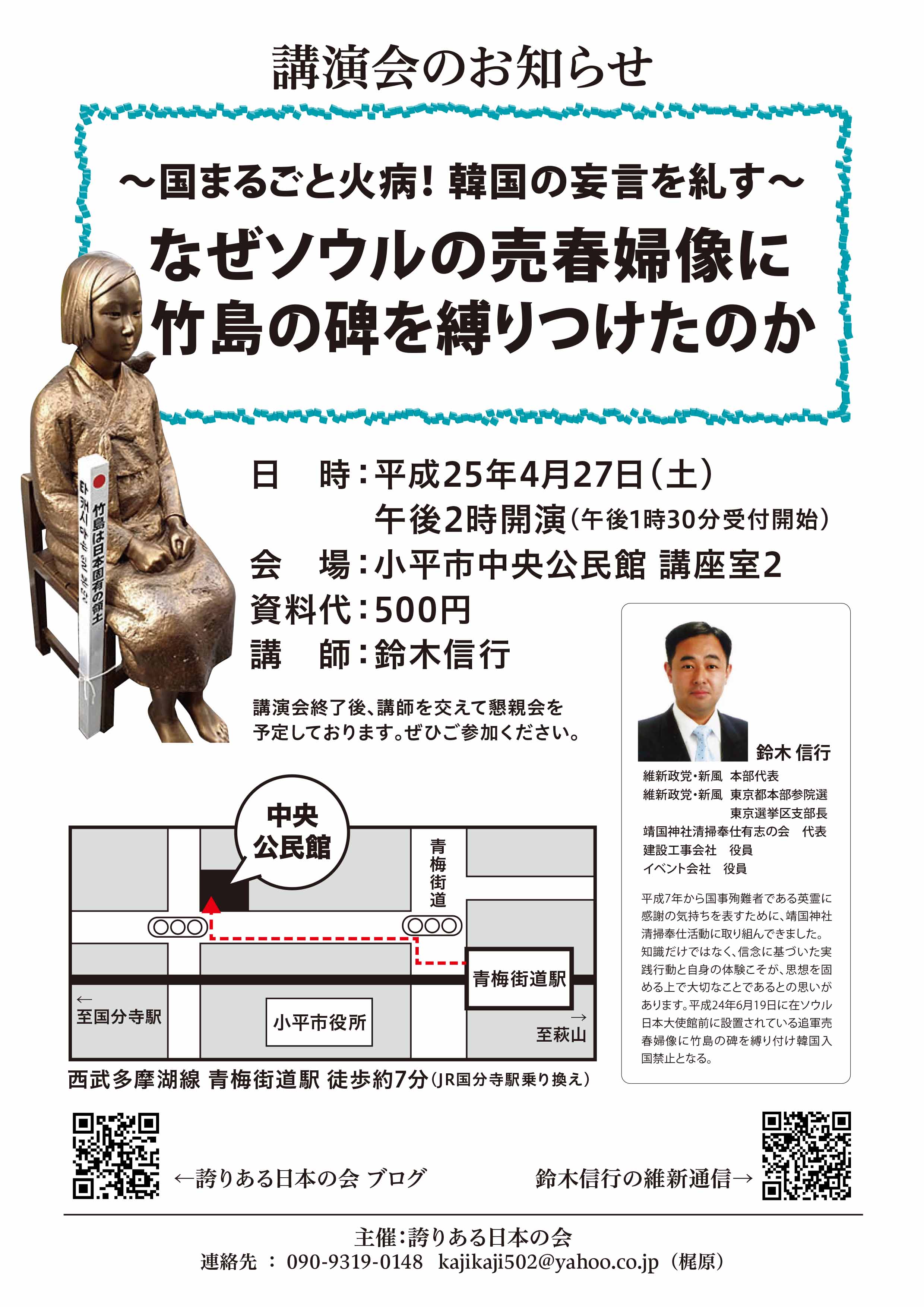 鈴木信行 (維新政党新風代表) 講演会国まるごと火病!韓国の妄言を糺す〜なぜソウルの売春婦像に竹島の碑を縛りつけたのか〜日 時:4月27日(土)午後2時開演 (午後1時30分受付開始)会 場:小平市中央公民館 講座室2 資料代:500円 講師:鈴木信行主催:誇りある日本の会 問い合わせ:090-9319-0148(梶原)