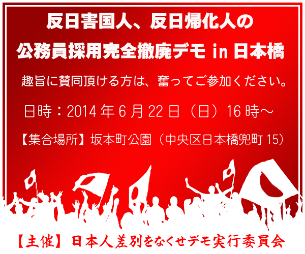 ニセモノ日本人の公務員採用完全撤廃を訴えるデモ行進を日本橋で行います。