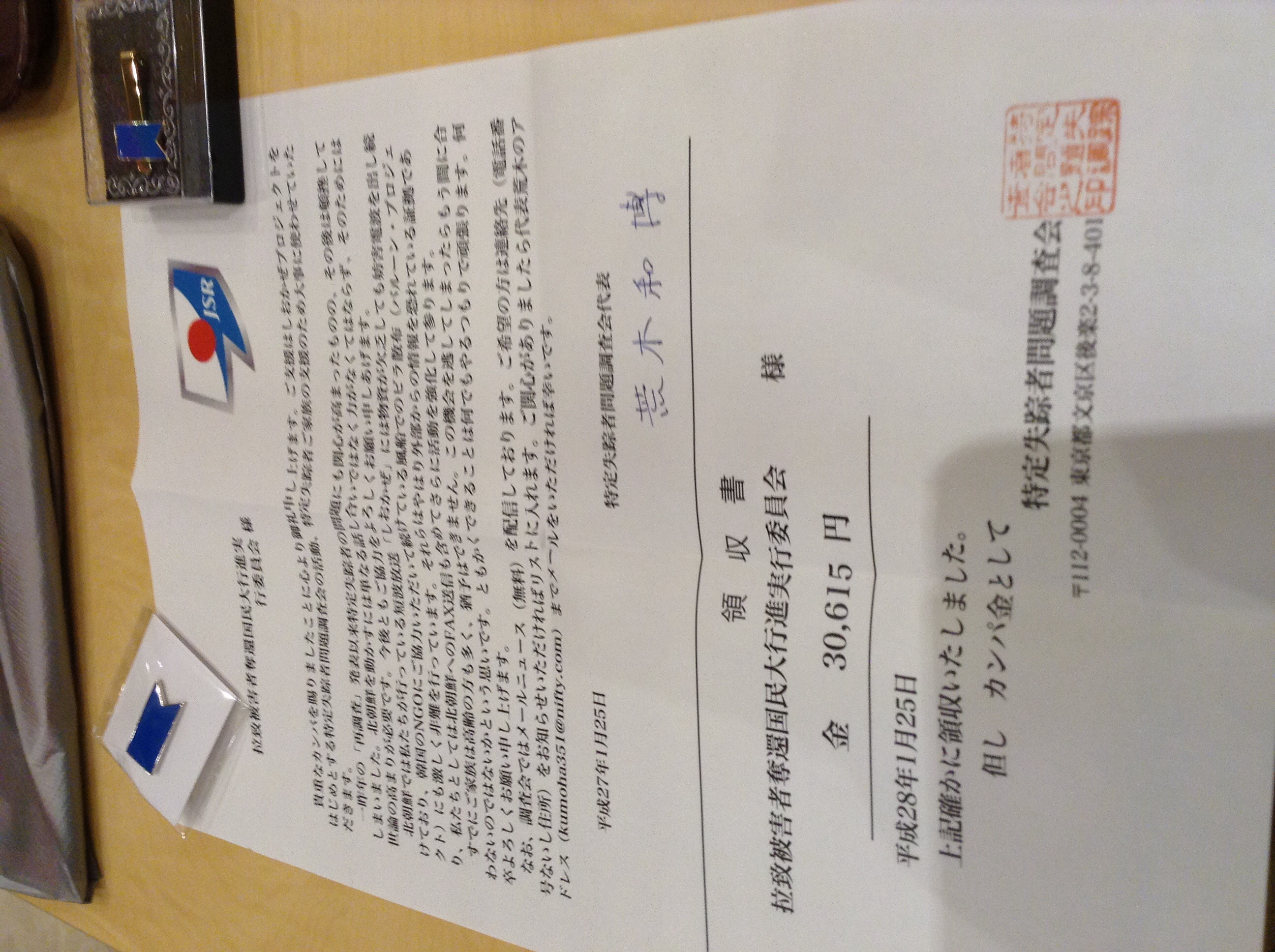 【日時】2月28日(日)13時開始16時終了【場所】靖國神社(九段下理科大周辺)【主催】拉致被害者奪還国民大行進実行委員会【共催】誇りある日本の会☆雨天中止【ご報告】1月24日署名活動で頂いた浄財の内30615円と署名100筆(80+20)を、調査会事務所に届けて参りました。弊会を通じ調査会に還流した浄財総額778879円、署名総数3280筆となりました、有り難う御座いました